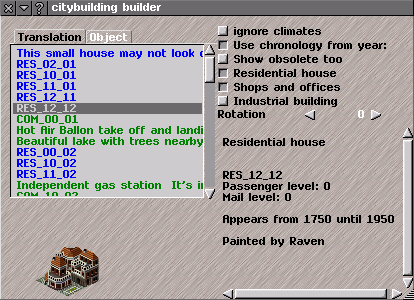 At the left, there is a list of all of the city buildings that are available to be built. The two tabs, Translation and Object allow switching between the base name as defined in the pakset (object) and the user-friendly name displayed in the game (translation). Click on an item in the list to see more information about that particular city building. To place the industry, click in the main game window on the desired location after selecting it from the list.