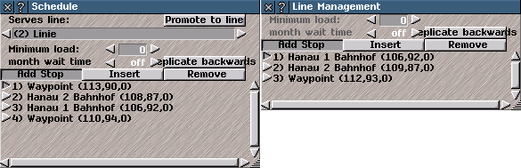 Insert: This inserts a stop or waypoint into a schedule immediately before the currently selected stop or waypoint. To insert a stop or waypoint, click on an existing stop or waypoint in list to select it, then click on the insert button (which changes the cursor to a "stop" arrow), then click the required point in the main game window.