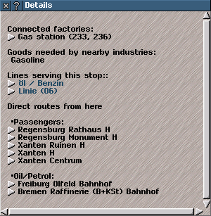 Direct routes from here:lists the names of stops that can be reached directly (i.e., without changing) by lines and convoys serving this stop. This is lised by the type of items (goods, mail and passnegers) that can be transported from here.